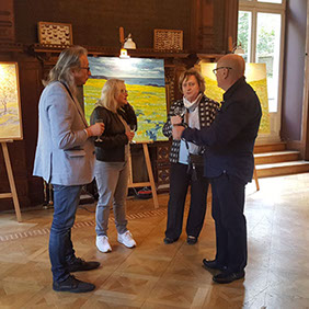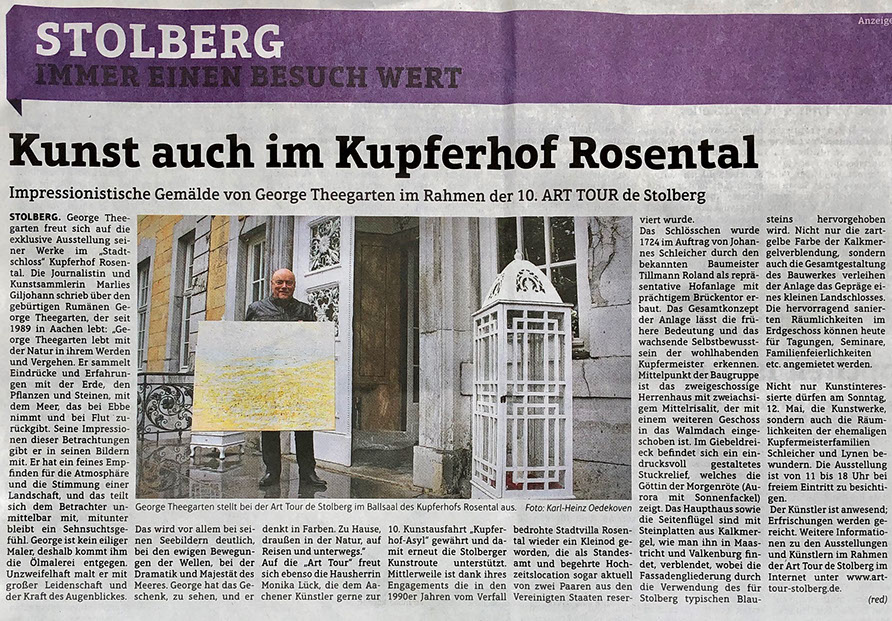 George Theegarten freut sich auf die exklusive Ausstellung seiner Werke im „Stadtschloss“ Kupferhof Rosental. Ebenso die Hausherrin Monika Lück, die dem Aachener Künstler gerne zur 10. Kunstausfahrt „Kupferhof-Asyl“ gewährt und damit erneut die Stolberger Kunstroute unterstützt. Mittlerweile ist dank ihres Engagements die in den 90er Jahren vom Verfall bedrohte Stadtvilla Rosental wieder ein Kleinod geworden, die als Standesamt und begehrte Hochzeitslocation
